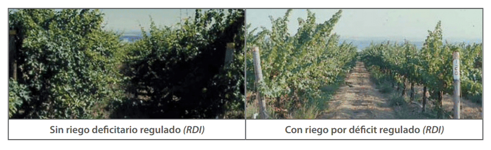 En los viñedos, por ejemplo, el RDI se utiliza con frecuencia para controlar el vigor de la vid y mejorar la calidad de la uva, limitando el suministro de agua en períodos no críticos —como después del cuajado del fruto—, pero proporcionando suficiente agua en las etapas críticas, como la maduración de las bayas.