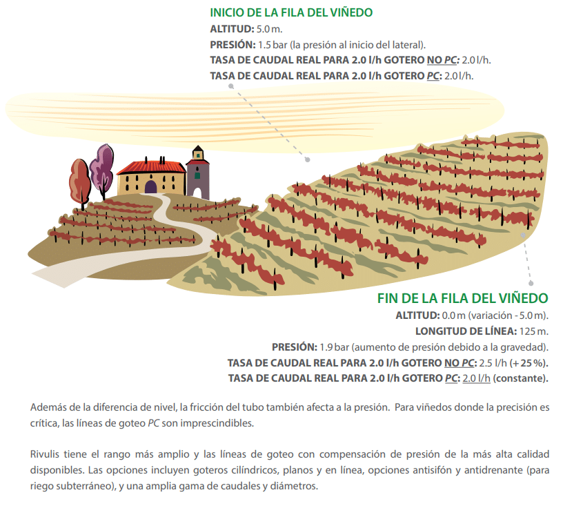Las líneas de goteo PC contienen goterores con una membrana reguladora de caudal. Esta membrana compensa las variaciones de presión a lo largo de la línea, garantizando que cada gotero emita el caudal exacto de agua por hora. Como se muestra en el diagrama siguiente, en una pendiente de cinco metros, la presión aumenta un 26% hacia la parte inferior del terreno. Sin una línea de goteo PC, las vides situadas en la parte baja recibirían un 25% más de agua y nutrientes que las de la zona superior. Con las líneas de goteo PC, todas las vides reciben la misma cantidad de agua, independientemente de la presión.