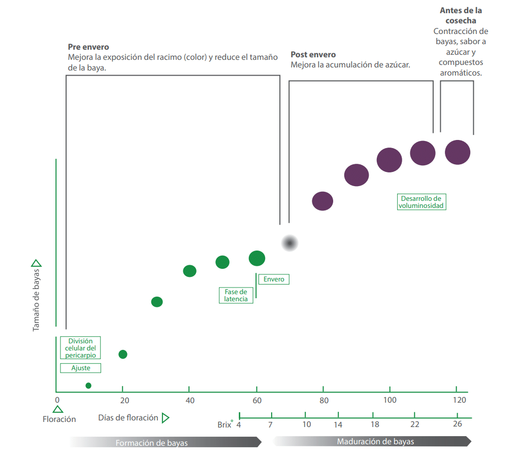El gráfico a continuación ilustra las diferentes etapas fenológicas del fruto en las que el sistema RDI puede influir significativamente en los resultados finales.