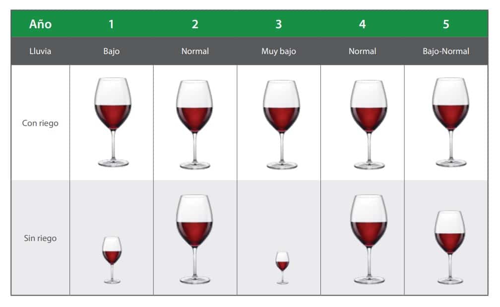 Un solo año de estrés hídrico elevado puede afectar negativamente a varias cosechas futuras. Un exceso de estrés por falta de agua en etapas fenológicas críticas puede reducir el potencial enológico de las uvas, generando menor contenido de azúcar y una disminución en los aromas, la acidez y la estabilidad del color. Si la humedad del suelo proveniente de las lluvias de invierno y primavera se agota y no hay riego suplementario disponible, el riesgo de producir vinos de menor calidad aumenta considerablemente.